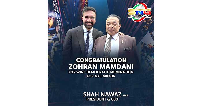 শাহ নেওয়াজ গ্রুপের ভাইস প্রেসিডেন্ট রানো নেওয়াজ এক বিবৃতিতে জোহরান মামদানির সাফল্য কামনা করে তাঁকে অভিনন্দন জানিয়েছেন।