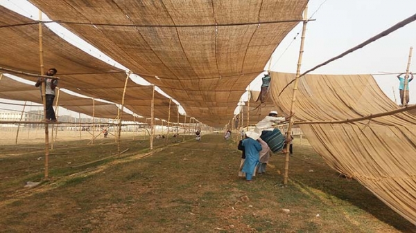 এরইমধ্যে মাঠের বিশাল এলাকা জুড়ে সামিয়ানা টানানো সম্পন্ন হয়েছে। বাকি অংশে সামিয়ানা টানানোর কাজ করছেন।