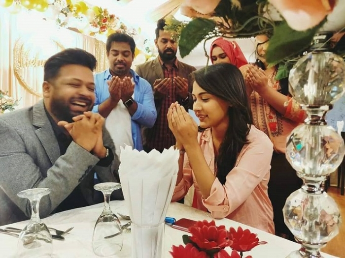 কিন্তু সম্প্রতি ঢাকা টাইমসের হাতে আসা একটা ছবি নতুন করে পুরোনো গুঞ্জনকে উসকে দিচ্ছে। ছবিতে দেখা যাচ্ছে, খ্যাতনামা দুই নির্মাতা রেদোয়ান রনি ও আশফাক নিপুন মোনাজাত ধরে দাঁড়িয়ে রয়েছেন আর মুখোমুখি বসে আছেন রাজীব ও মেহজাবিন। হাস্যোজ্জ্বল রাজীবের বিপরীতে মোনাজাত ধরে বসে আছেন মেহজাবীনও। তবে কী বিয়ের আয়োজন স¤পন্ন হয়ে গেছে ঢাকাই মিডিয়ার ‘বিজ্ঞাপনের বরপুত্র’ আদনান আল রাজীব ও মেহজাবীনের?