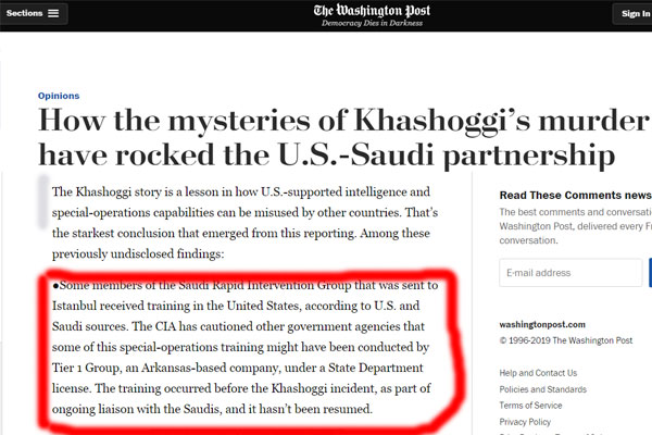 সৌদি সাংবাদিক জামাল খাশোগিকে নির্মমভাবে হত্যায় যারা অংশ নিয়েছিলেন তাদের প্রশিক্ষণ দিয়েছিল যুক্তরাষ্ট্র। যুক্তরাষ্ট্রের প্রভাবশালী সংবাদমাধ্যম ওয়াশিংটন পোস্ট এ তথ্য প্রকাশ করেছে।