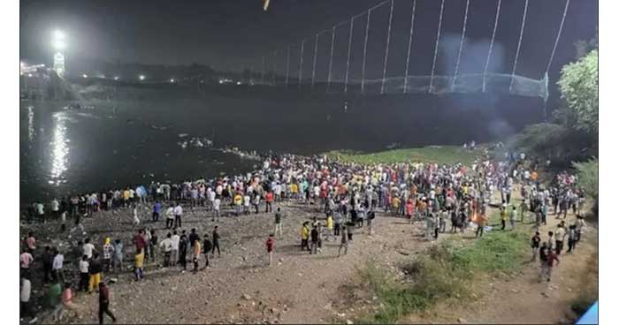 বিবিসি বলছে, আজ রোববার (৩০ অক্টোবর) দেশটির স্থানীয় সময় সন্ধ্যা নাগাদ মোরবি জেলায় মাছু নদীর উপর ওই ঝুলন্ত সেতু হুড়মুড়িয়ে ভেঙে পড়ে। এই সময় নদীতে শতাধিক মানুষ ছিটকে পড়ে যায়। নিখোঁজদের উদ্ধারে অভিযান চলছে।