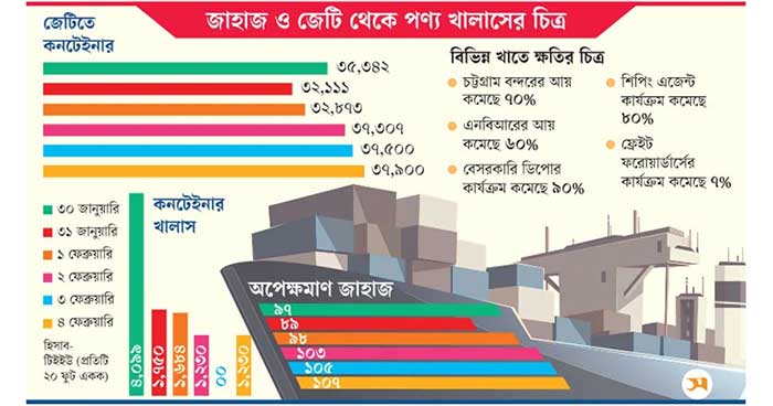 কর্মবিরতি শুরুর আগের দিন (৩০ জানুয়ারি) ডিপো থেকে ২০ ফুট এককের (টিইইউ) রপ্তানি কনটেইনার বন্দরে যায় ২ হাজার ৯৪৭। বন্দর থেকে আমদানি কনটেইনার ডিপোতে আসে ১ হাজার ৪২১। ২৪ ঘণ্টা কর্মবিরতি শুরুর প্রথম দিন মঙ্গলবার রপ্তানি কনটেইনার ডিপো থেকে বন্দরে যায় ৪৩৭। আর আমদানি কনটেইনার ডিপোতে আসে ১৩১। অনির্দিষ্টকালের কর্মবিরতি শুরুর প্রথম দিন (গতকাল রাত ৮টা পর্যন্ত ) রপ্তানি কনটেইনার ডিপো থেকে বন্দরে যায় মাত্র ২০৫। বন্দর থেকে আমদানি কনটেইনার ডিপোতে আসে মাত্র ৭০ টিইইউ। অথচ স্বাভাবিক সময়ে ডিপো থেকে রপ্তানি কনটেইনার যায় প্রতিদিন গড়ে ২ হাজার ৮০০। আর আমদানি কনটেইনার আসে গড়ে ১২০০। এ হিসাবে আমদানি কনটেইনার কমেছে গড়ে ৯৫ শতাংশ। রপ্তানি কনটেইনার কম যাচ্ছে গড়ে ৯৩ শতাংশ।