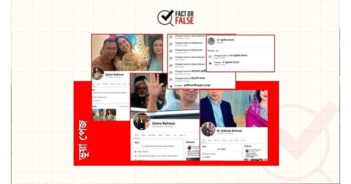 ফ্যাক্ট অর ফলস এর যাচাইয়ে দেখা যায়, জায়মা রহমানের নামে ফেসবুকে ১২০ টি পেজ এবং ডা. জোবাইদা রহমান এর নামে ১৫ টি পেজ রয়েছে।