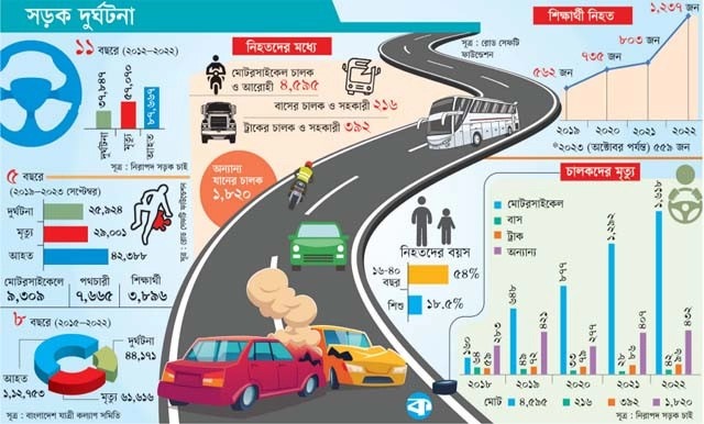 ২০১২ থেকে ২০২২ সাল পর্যন্ত নিরাপদ সড়ক চাই (নিসচা) সংগঠনের প্রকাশিত বার্ষিক প্রতিবেদন বিশ্লেষণ করে এসব তথ্য পাওয়া গেছে। এই ১১ বছরে সারা দেশে মোট ৩৭ হাজার ৮৪৭টি সড়ক দুর্ঘটনায় ৫৭ হাজার ৭০ জনের মৃত্যু হয়েছে। আহত হয়েছে ৮৭ হাজার ৬৬৭ জন।