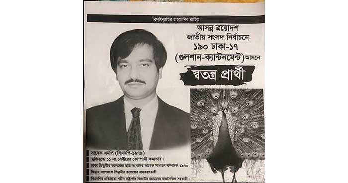 এবার ্সংসদ নির্বাচনে নির্বাচনে তিনি স্বতন্ত্র প্রার্থী। অনেক টিভি মিডিয়ায় তিনি নিজেকে যোগ্য প্রার্থী হিসেবে সাক্ষাৎকার দিচ্ছেন। প্রতিদ্বন্দ্বিতা করছেন ঢাকা-১৭ আসন থেকে। এই আসনে বিএনপির প্রার্থী তারেক রহমান ও জামায়াতের ডা.খালিদুজ্জামান।