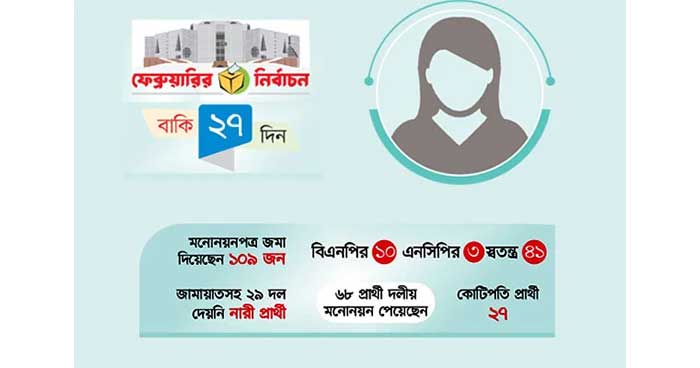 নারী প্রার্থী দেয়নি জামায়াতসহ ২৯ দল : এবারের নির্বাচনে ৫১টি রাজনৈতিক দল অংশগ্রহণ করলেও নারী প্রার্থী দেয়নি অনেক রাজনৈতিক দল। মাত্র ২২টি দল নারী প্রার্থী দিয়েছে। ২৯টি দল কোনো নারী প্রার্থী দেয়নি। বড় দলগুলোর মধ্যে জামায়াতে ইসলামীর পক্ষ থেকে কোনো নারী প্রার্থী ছাড়াই ১৭৬টি মনোনয়ন জমা পড়েছে। যদিও দলটির নেতারা দাবি করেন, দলের নেতৃত্বের কমপক্ষে ৪০ শতাংশ নারী। এরপর ইসলামী আন্দোলন বাংলাদেশ ২৬৮টি মনোনয়ন জমা দিলেও সেখানে কোনো নারী প্রার্থী নেই। একইভাবে খেলাফত মজলিস, বাংলাদেশ ইসলামী ফ্রন্টসহ অন্য দলগুলো শুধু পুরুষের প্রার্থী করেছে। নারী প্রার্থী দেয়নি লিবারেল ডেমোক্রেটিক পার্টি, জনতার দল, বাংলাদেশ সাংস্কৃতিক মুক্তি জোটও।