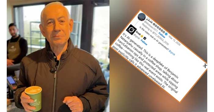 ইসরায়েলি প্রধানমন্ত্রী বেনিয়ামিন নেতানিয়াহুর মৃত্যুকে কেন্দ্র করে ছড়ানো গুজবের মধ্যে তার একটি কফি পানের ভিডিও নতুন করে বিতর্কের জন্ম দিয়েছে। ভিডিওটিকে এআই দিয়ে তৈরি একটি উন্নতমানের ‘ডিপফেইক’ বলে দাবি করেছে ইলন মাস্কের এআই চ্যাটবট গ্রক। খবর এনডিটিভির।