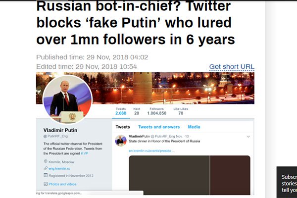 কিন্তু এই অ্যাকাউন্টে ট্যুইটারের ভেরিফায়েড ‘নীল টিক’ ছিল না। রুশ প্রেসিডেন্টের নামে ভুয়া এই অ্যাকাউন্ট খোলা হয় ২০১২ সালে এবং এতে বিশেষ করে তার জনসম্মুখে আসা সংক্রান্ত বিভিন্ন অফিসিয়াল লিঙ্ক পোস্ট করা হতো।
