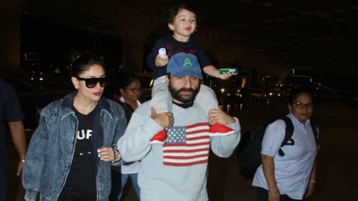 মুম্বাই বিমানবন্দরে তৈমুরকে কাঁধে চড়িয়ে হেঁটে যাচ্ছেন সাইফ আলি খান। সঙ্গে তৈমুরের মা বলিউড অভিনেত্রী কারিনা কাপুরও আছেন।