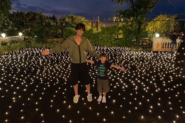 ছবিতে দেখা যাচ্ছে, চারপাশে দীপাবলির মতো প্রদীপের আলোয় সাজানো আঙিনা আর তার মাঝখানে দুই হাত প্রসারিত করে দাঁড়িয়ে আছে বাবা-ছেলে। ছোট্ট আব্রামও বাবার মতোই দিয়েছে সুপারস্টারের লুক।