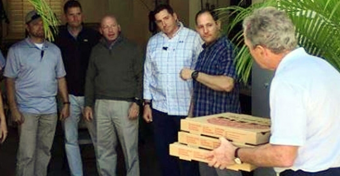 একটি বাড়ির সামনে কয়েকজন ব্যক্তি দাঁড়িয়ে রয়েছেন। তাদের সামনে দণ্ডায়মান একজন বয়স্ক ব্যক্তি। হাতে তিনটি পিৎজার বক্স। সাদা টি-শার্ট পরিহিত ওই ব্যক্তিটি আর কেউ নন-সাবেক মার্কিন প্রেসিডেন্ট জর্জ ডব্লিউ বুশ। দেশটির সরকারি কর্মকর্তা-কর্মচারীদের বাড়ি বাড়ি গিয়ে পিৎজা বিতরণ করছেন তিনি।