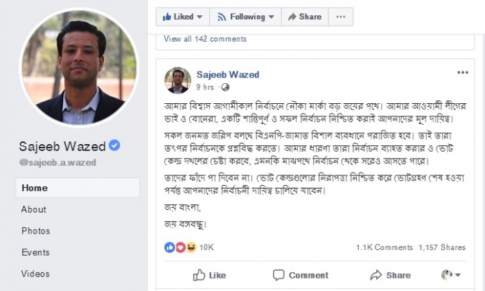 ফেসবুক পোস্টে জয় বলেন, আমার বিশ্বাস একাদশ সংসদ নির্বাচনে নৌকা মার্কা বড় জয়ের পথে। আওয়ামী লীগের ভাই ও বোনেরা, একটি শান্তিপূর্ণ ও সফল নির্বাচন নিশ্চিত করাই আপনাদের মূল দায়িত্ব। সব জনমত জরিপ বলছে বিএনপি-জামাত বিশাল ব্যবধানে পরাজিত হবে। তাই তারা তৎপর নির্বাচনকে প্রশ্নবিদ্ধ করতে পারে। আমার ধারণা তারা নির্বাচন ব্যাহত করার ও ভোট কেন্দ্র দখলের চেষ্টা করবে, এমনকি মাঝপথে নির্বাচন থেকে সরেও আসতে পারে। তাদের ফাঁদে পা দেবেন না। ভোট কেন্দ্রগুলোর নিরাপত্তা নিশ্চিত করে ভোটগ্রহণ শেষ হওয়া পর্যন্ত আপনাদের নির্বাচনী দায়িত্ব চালিয়ে যাবেন।