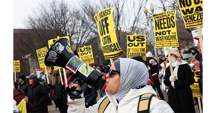 ট্রাম্প প্রশাসনের ভেনেজুয়েলায় একতরফা সামরিক হস্তক্ষেপের প্রতিবাদে যুক্তরাষ্ট্রজুড়ে কয়েকটি শহরে রবিবার বিক্ষোভ অনুষ্ঠিত হয়েছে। বিক্ষোভকারীরা সম্ভাব্য যুদ্ধের বিরোধিতা করে এবং যুক্তরাষ্ট্রের অভিযানে মাদুরোকে ধরে যুক্তরাষ্ট্রে নিয়ে এসে মাদক পাচার সংক্রান্ত অভিযোগে আদালতে তোলাকে অবৈধ বলে আখ্যা দেয়।