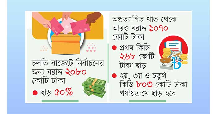 সূত্র জানায়, মূল বাজেট থেকে বরাদ্দের ৫০ শতাংশ হিসাবে ছাড় করেছে ১ হাজার ৪০ কোটি টাকা। এছাড়া বর্ধিত ব্যয়ের প্রস্তাবটি সামনে এলে অপ্রত্যাশিত খাত থেকে বরাদ্দ দেওয়া অর্থ থেকে প্রথম কিস্তি বাবদ গত সপ্তাহে ছাড় করা হয়েছে ২৬৭ কোটি টাকা। অপ্রত্যাশিত খাতের বাকি তিন কিস্তির ৮০২ কোটি টাকা পর্যায়ক্রমে ছাড় করা হবে।