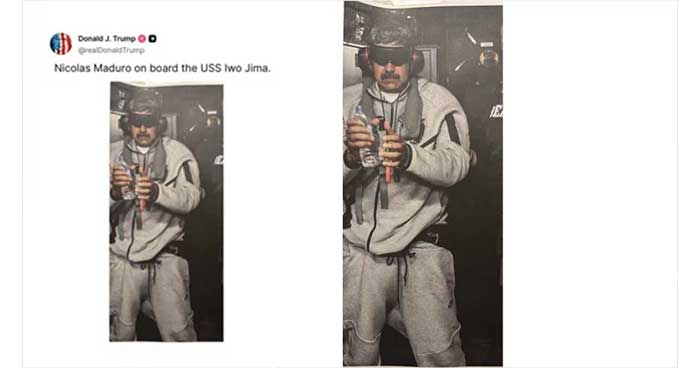 ট্রাম্প ট্রুথ সোশালে ভেনেজুয়েলার প্রেসিডেন্টের একটি নতুন ছবি শেয়ার করেছেন। সেখানে তিনি দাবি করেন, ভেনেজুয়েলার প্রেসিডেন্ট নিকোলাস মাদুরোকে ইউএসএস আইও জিমা জাহাজে দেখা যাচ্ছে। যে জাহাজে করে ভেনেজুয়েলার নেতাকে যুক্তরাষ্ট্রে আনা হচ্ছে বলে তিনি আগেই ফক্স নিউজকে জানিয়েছিলেন।