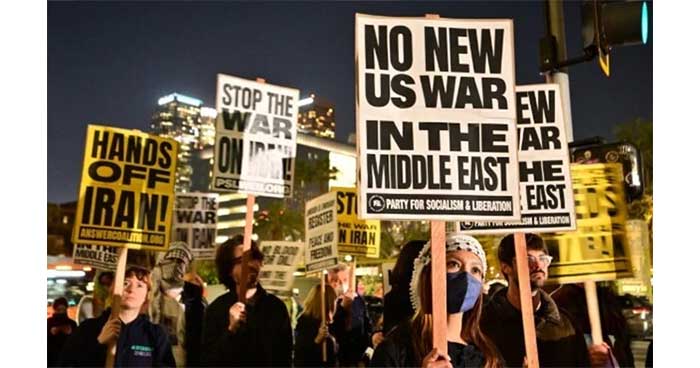 লস অ্যাঞ্জেলসে বিক্ষোভকারীরা রাস্তায় নেমে ‘নো ওয়ার অন ইরান’ (ইরানে যুদ্ধ নয়) স্লোগান দেন এবং মধ্যপ্রাচ্যে যুক্তরাষ্ট্রের সামরিক সম্পৃক্ততা বন্ধের দাবি জানান।