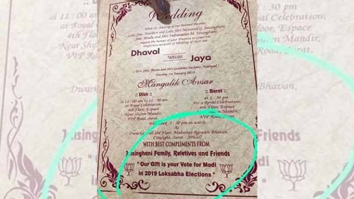 এটুকুতেই থেমে থাকেননি এই যুগলের অভিভাবকরা। তারা রীতিমতো অতিথিদের কাছে অনুরোধ করেছেন বিয়েতে কোনো উপঢৌকন লাগবে না। দয়া করে যেন ২০১৯ সালের লোকসভা নির্বাচনে মোদিকে একটি ভোট দেয়া হয়। বিয়েটি হবে চলতি মাসের ১১ তারিখে।