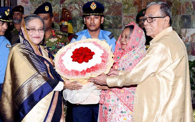 সোমবার সন্ধ্যা পৌনে ৮টার দিকে প্রধানমন্ত্রী বঙ্গভবনে পৌঁছালে রাষ্ট্রপতি ও তার স্ত্রী রাশিদা খানম তাকে অভ্যর্থনা জানান।