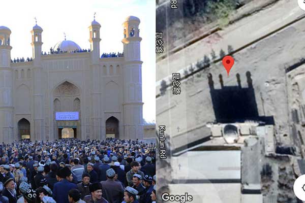 দুজন বিশিষ্ট কর্মীর পোস্ট করা টুইটারে দেখা যায়, জিনজিয়াংয়ের ল্যান্ডমার্কের অনন্ত দুটি মসজিদের চিত্র দেখা যায়, যেখানে মসজিদের আগের চিত্র ও পরের চিত্র দেয়া হয়েছে। এসব ছবি স্যাটেলাইট থেকে ধারণকৃত। এতে প্রমাণ হিসেবে ধ্বংসের আগের চিত্রের সঙ্গে পরের চিত্রের তুলনা দেখানো হয়।