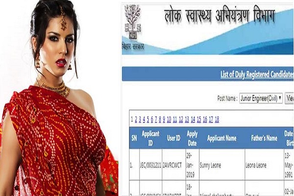 হিন্দুস্তান টাইমস সংবাদ মাধ্যমে প্রকাশিত খবর অনুযায়ী, বিহারের পাবলিক হেলথ্ ইঞ্জিনিয়ারিং ডিপার্টমেন্ট জুনিয়র ইঞ্জিনিয়ার পদে ভর্তির জন্য পরীক্ষা নেয়। যার মেধা তালিকাও প্রকাশ করা হয়। আর তাতেই দেখা যায় প্রথম স্থানে নাম রয়েছে সানি লিওন নামের এক শিক্ষার্থীর।