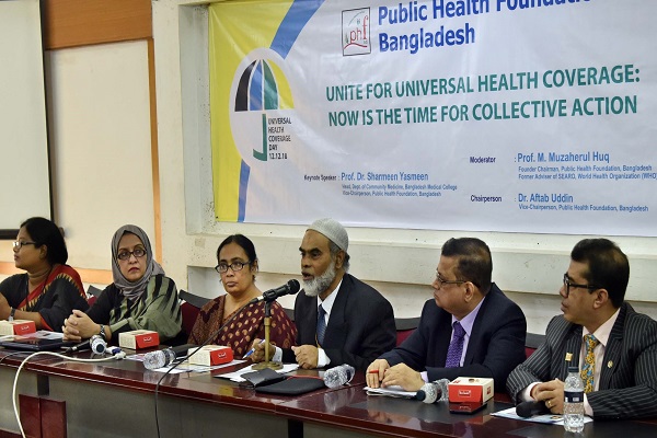 বুধবার জাতীয় প্রেসক্লাবে ইউনিভার্সাল হেলথ কভারেজ ডে-২০১৮ উপলক্ষ্যে পাবলিক হেলথ ফাউন্ডেশনের আয়োজনে এক আলোচনা সভায় তিনি এসব কথা বলেন। বিশ্বের অন্যান্য দেশের মতো বাংলাদেশেও দিবসটি পালিত হয়েছে। দিবসটি উপলক্ষ্যে এবারের প্রতিপাদ্য ছিল ‘সার্বজনীন স্বাস্থ্য সুরক্ষা অর্জনে অসংক্রামক রোগের নিয়ন্ত্রণ ও প্রতিরোধ’।