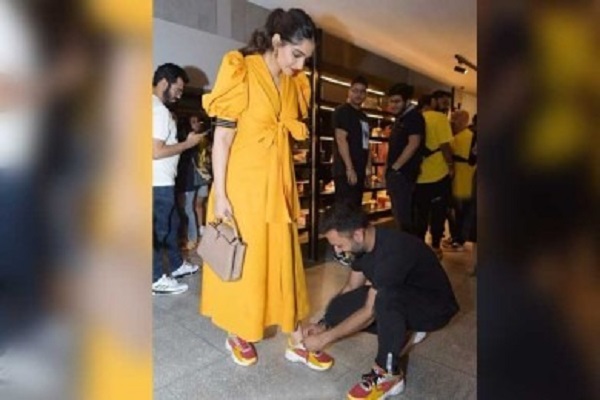 সন্তানসম্ভবা সোনমের জুতার ফিতা বেঁধে দেন স্বামী আনন্দ