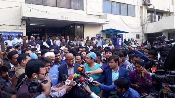 ‌তি‌নি ব‌লেন, ওনার (ওবায়দুল কা‌দের) তিন‌টি ব্ল‌কের ম‌ধ্যে এক‌টি যেটা প্রধান অর্থাৎ এলই‌ডিতে যে ৯৯ ভাগ প্রোব‌লেম ছি‌লো শুধু সে‌টি‌কে সা‌রি‌য়ে‌ছি। এরপর একটু উন্ন‌তির দি‌কে গি‌য়ে‌ছি‌লো। কিন্তু সেটা পর্যাপ্ত নয়। বা‌কি ব্লকগু‌লোও সারানার দরকার। কিন্তু উনার শারী‌রিক অবস্থা যা তা‌তে বা‌কি দু‌টো এই মুহু‌র্তে সারানো যা‌বে না। সারাতে গেলে বিপদ ঘট‌বে। আমরা আসা‌দের সর্বোচ্চ দি‌য়ে চেষ্টা কর‌ছি। সব সোর্স আমরা ইউজ কর‌ছি।