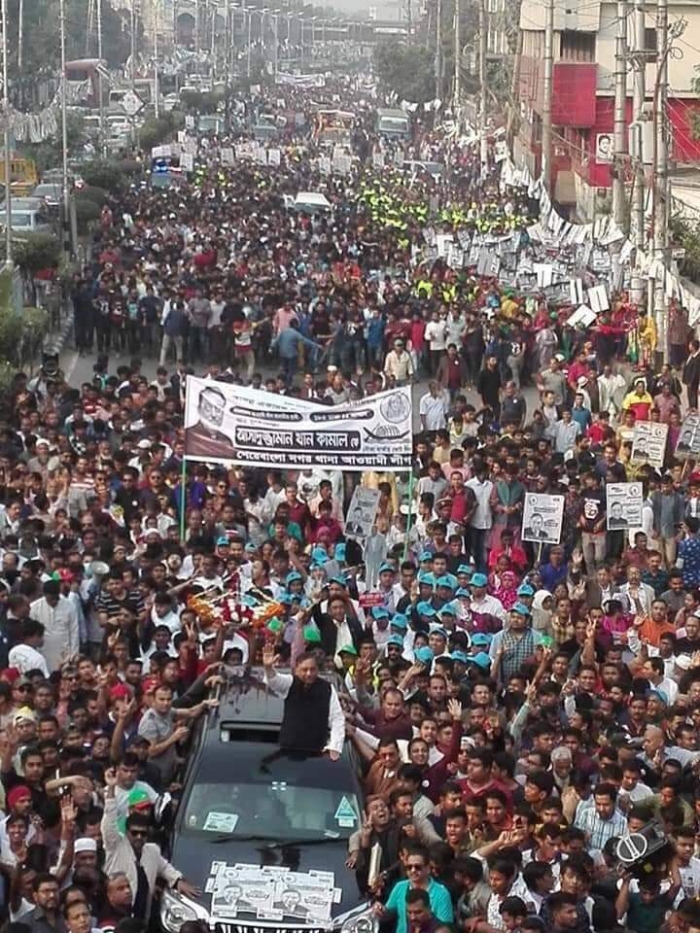 বৃহস্পতিবার (২৭ ডিসেম্বর) রাজধানীর ফার্মগেট, কাওরান বাজার, মগবাজার এবং মালিবাগ এলাকা বিকাল ৪টার দিকে জনসমুদ্রে পরিণত হয়ে যায়। বলা হচ্ছে, এবারের নির্বাচনে এটিই হচ্ছে সব চেয়ে বড় শোডাউন। ধনী-গরীব নির্বিশেষে প্রায় তিন লাখ মানুষের সমাগম হয় এই নির্বাচনী শোডাউনে।