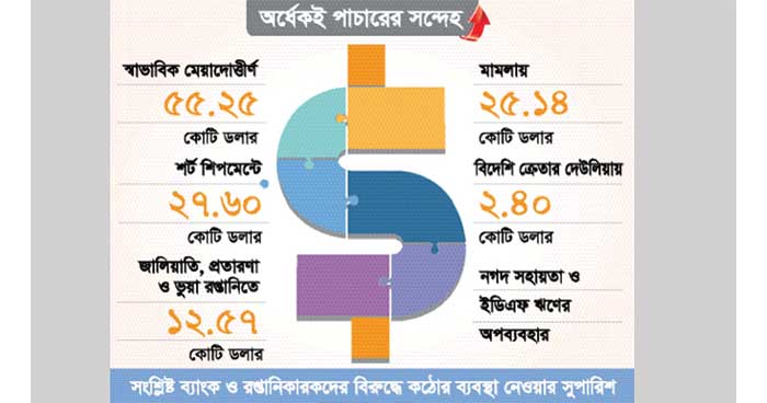 ৫৫ কোটি ডলার পাচারের সন্দেহ : স্বাভাবিক নিয়মে মেয়াদোত্তীর্ণ ৫৫ কোটি ২৫ লাখ ডলারের মধ্যে ২৮ কোটি ২২ লাখ ডলার ২০২০ সাল ও তার পরবর্তী কয়েক মাসের। বাকি ২৭ কোটি ৩ লাখ ডলার মেয়াদোত্তীর্ণ হয় ২০২১ সাল ও তার পরবর্তী কয়েক মাসে। বাংলাদেশ ব্যাংকের প্রতিবেদনে বলা হয়, এগুলো সহজে আদায়যোগ্য হওয়া সত্ত্বেও আদায় করা হচ্ছে না কিংবা আদায় করা যাচ্ছে না। করোনা পরিস্থিতি উন্নতি হওয়ার পরও এখন পর্যন্ত আদায় না হওয়ার বিষয়টি অনভিপ্রেত। দীর্ঘ সময় ধরে এ অর্থ অপ্রত্যাবাসিত থাকার বিষয়ে ব্যাংকগুলোর পক্ষ থেকেও যৌক্তিক কোনো কারণ উপস্থাপন করা হয়নি। আবার অপ্রত্যাবাসিত রপ্তানির বিপরীতে নগদ সহায়তা পেতে আইনি কোনো সমস্যা না থাকায় রপ্তানিকারকদের এসব আয় দেশে আনার ক্ষেত্রে তেমন আগ্রহ দেখা যাচ্ছে না। ফলে রপ্তানি মূল্য পাচার তথা বাণিজ্যভিত্তিক অর্থপাচারের সম্ভাবনাকে উড়িয়ে দেওয়া যায় না। তাই এসব অর্থ আদায়ে জরুরি ভিত্তিতে কার্যকর ব্যবস্থা গ্রহণ আবশ্যক।