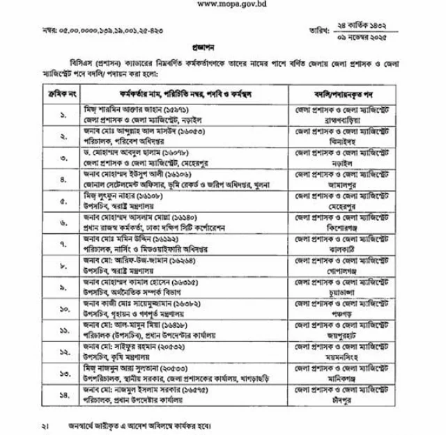 জাতীয় নির্বাচনকে সামনে রেখে আরও ১৪ জেলায় নতুন জেলা প্রশাসক (ডিসি) নিয়োগ দিয়েছে সরকার। আজ রবিবার (৯ নভেম্বর) সন্ধ্যার পর এ বিষয়ে প্রজ্ঞাপন জারি করেছে জনপ্রশাসন মন্ত্রণালয়।