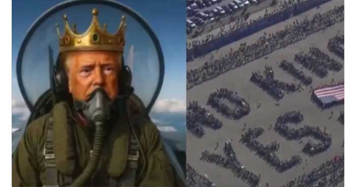 মার্কিন প্রেসিডেন্ট ডোনাল্ড ট্রাম্প সামাজিক মাধ্যমে এমন একটি ভুয়া ভিডিও প্রকাশ করেছেন, যেখানে তাকে মুকুট পরা অবস্থায় দেখা যায় এবং ‘কিং ট্রাম্প’ লেখা একটি জেটে উড়ে যেতে দেখা যায়। এ সময় সেই বিমান থেকে প্রতিবাদকারীদের ওপর বাদামী তরল (মলের মতো) ফেলা হচ্ছে।