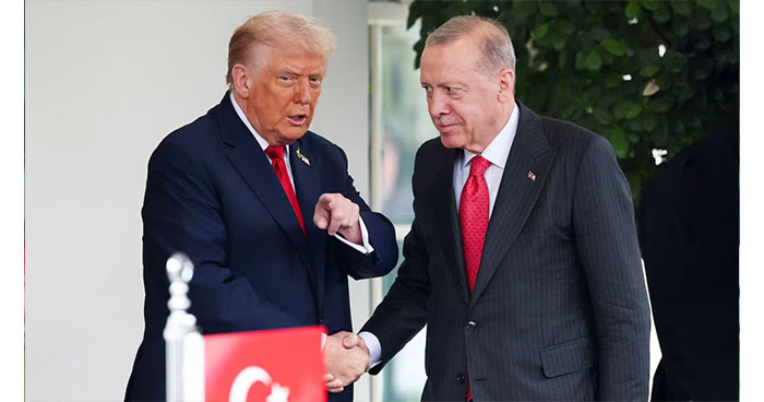 বৃহস্পতিবার (২৫ সেপ্টেম্বর) রয়টার্স জানিয়েছে, হোয়াইট হাউসে একসঙ্গে বসে এরদোয়ানকে ‘খুব কঠোর মানুষ’ বলে অভিহিত করেন ট্রাম্প এবং তিনি স্পষ্ট জানিয়ে দেন—ইউক্রেনে আগ্রাসন চলাকালে তুরস্কের রাশিয়ার তেল কেনা যুক্তরাষ্ট্র পছন্দ করছে না। বর্তমানে ইউরোপের মধ্যে তুরস্ক, হাঙ্গেরি ও স্লোভাকিয়া রুশ তেলের প্রধান ক্রেতা।